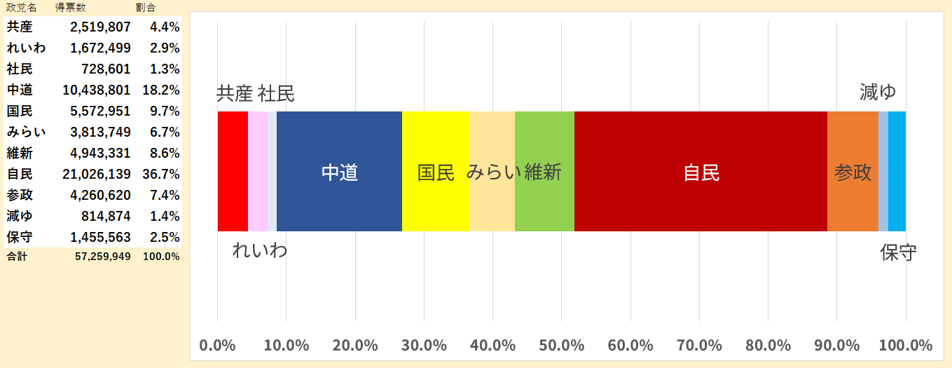 この画像は、2026衆院選の比例の結果を全国集計し、主観で左翼政党ほど左、右翼政党ほど右へ配置していたものです。なお、安楽死党は仮に一番左に配置しましたが、画像やグラフからは消しています。影響が小さすぎたためです。